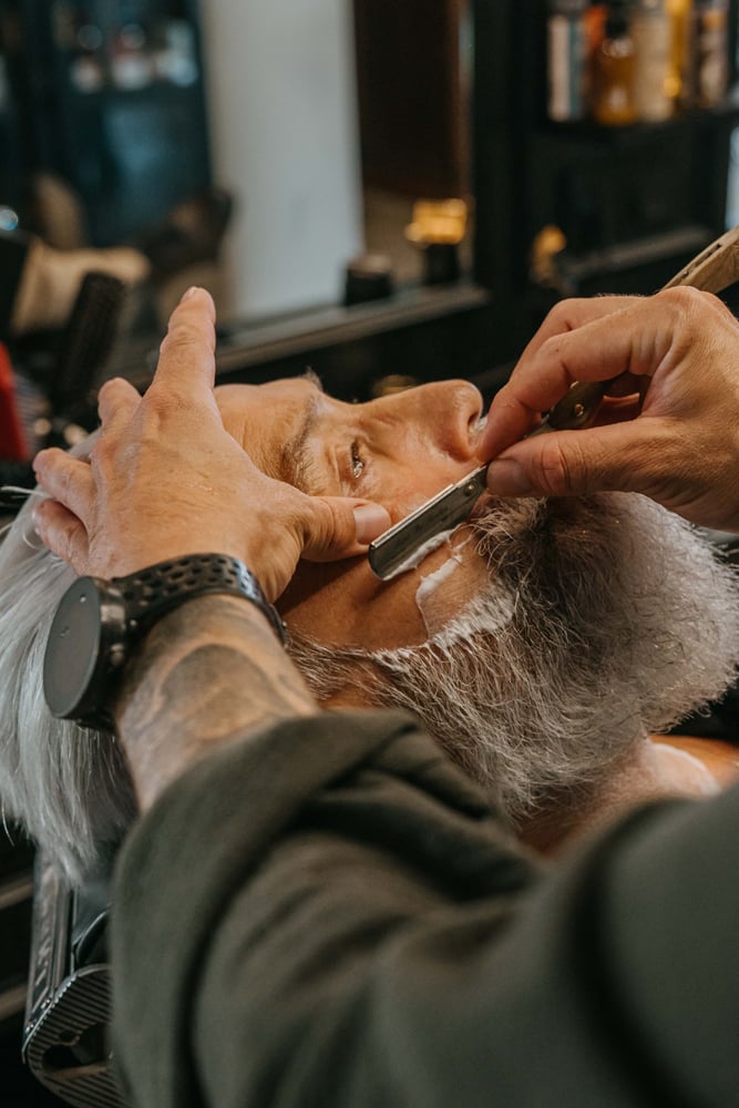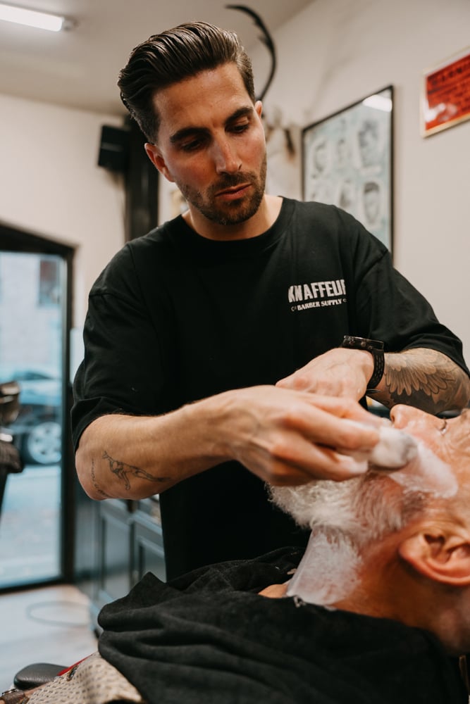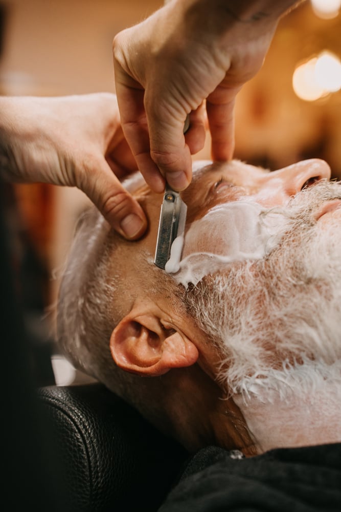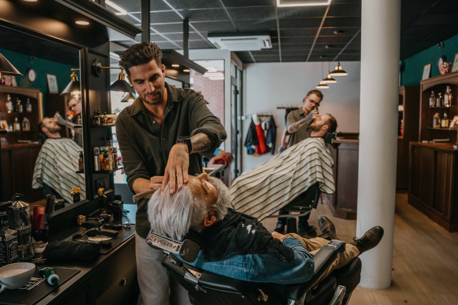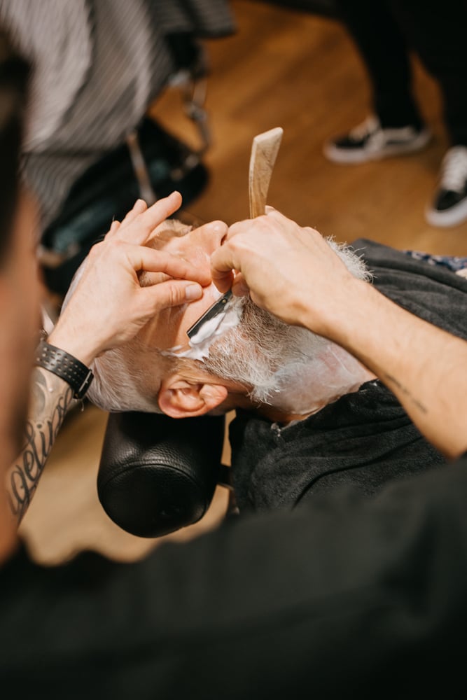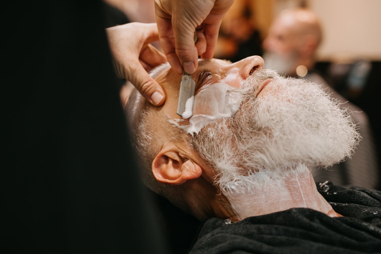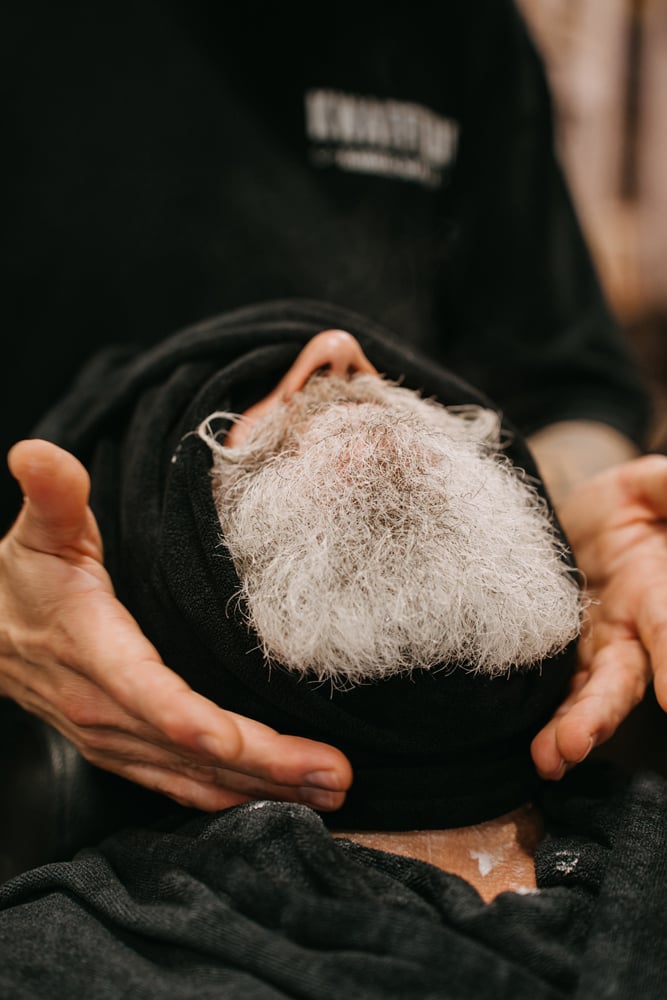 Scheren volgens de regels van de kunst: met warme handdoeken, goede scheerzeep, een scheerbeurt met open scheermes en de perfecte verzorging achteraf.
